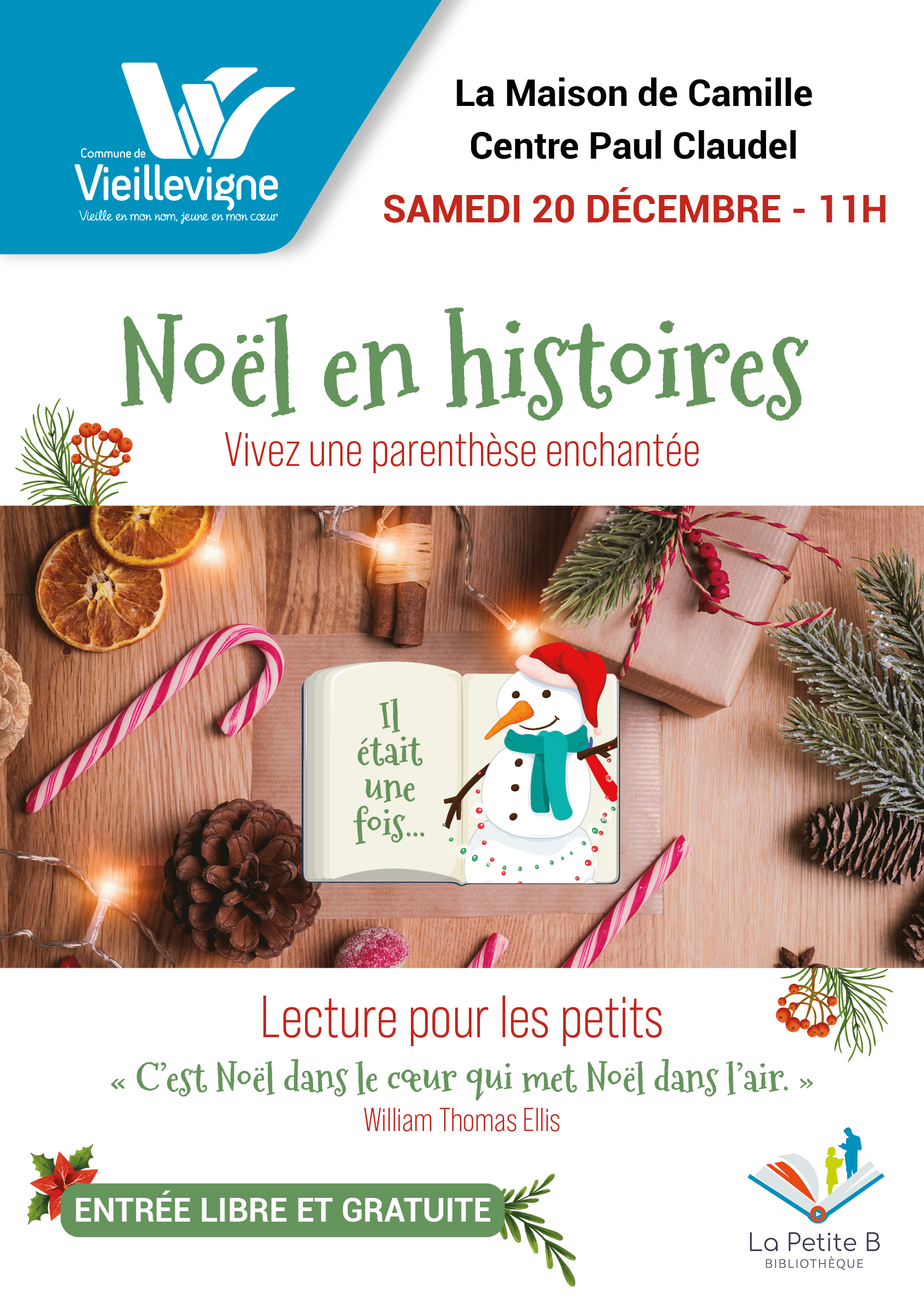 Elle vous propose, pendant une demi-heure, de raconter aux petits des histoires autour de Noël. 2 volontaires de l'équipe vous donnent rendez-vous le samedi 20 décembre à 11h, dans les locaux de La Maison de Camille, centre Paul Claudel, pour un petit moment enchanté. Ne soyez pas en retard, si vous voulez en profiter !